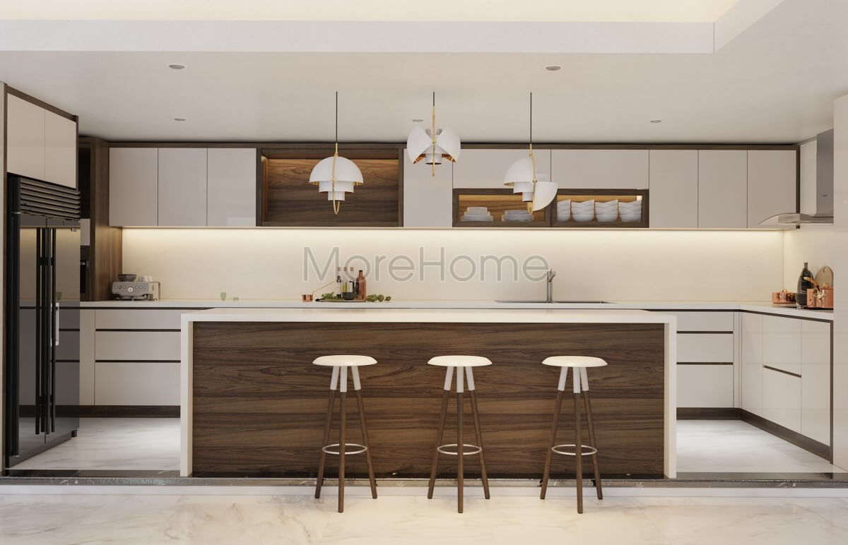 Thiết kế nội thất phòng bếp hiện đại sử dụng tone màu trắng chủ đạo tạo nên không gian tinh tế và tiện nghi