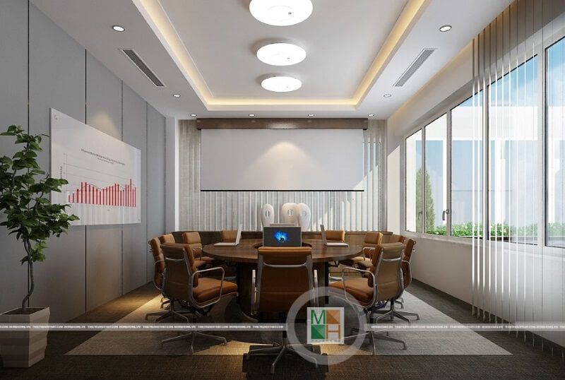 Mẫu thiết kế nội thất cho phòng họp văn phòng của công ty Đèo Cả cao cấp được bố trí hợp lí và khoa học.